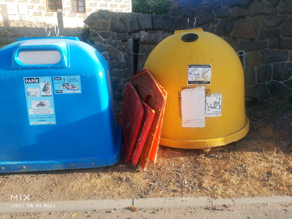 Z důvodů bezpečnosti zejména dětí či psů je prosím nenechávejte opřené o kontejner. Plastový zahradní domeček fakt nepatří viz foto do běžného plastu! Patří do nebezpečného odpadu nebo do sběrného dvoru.